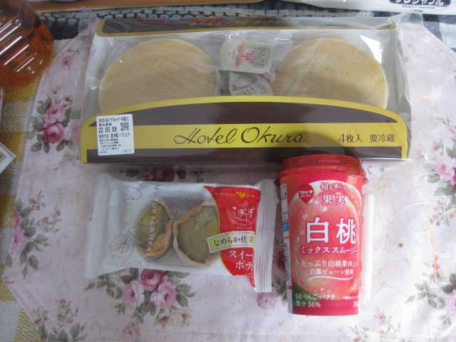 そして、デザートにとまたホテルオークラのホットケーキ、これは朝食用かな。それと、スイートポテトと白桃スムージーです。