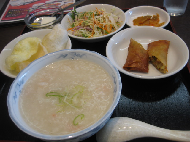 先月オープンしたばかりの中華やさん中華楼でたべた海鮮粥セットです。揚げせんべいみたいなものがみえますけど、たしかメニューの写真はショーロンポーでしたよ。