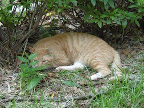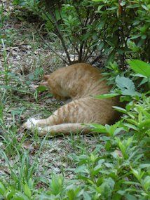 もう1匹発見の茶トラは、野良猫らしく茂みに隠れてお休み中。