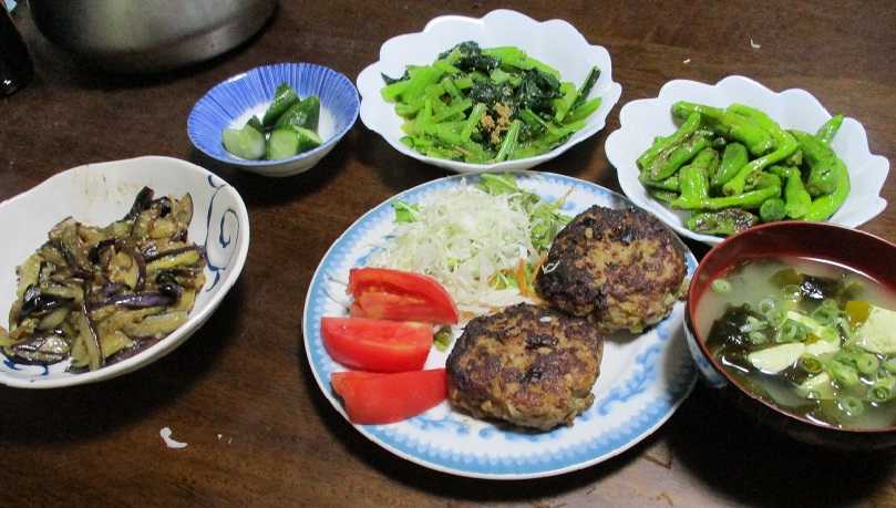 9月7日の日曜日に「イキイキサロン」という毎月第1日曜日に行われている会に参加しました。この日行われたのは、隣町の診療所の医師の講演とグループに分かれて「あと半年の余命宣言をされたらあなたはどのように過ごしたいですか」という質問の話し合いでした。そういわれてもなかなか思い浮かびません。そういう宣告はされないほうがいいですね。充実した日々を送れるのが一番いいですね。久し振りに今日の夕食を載せます。今日はハンバーグ、材料はひき肉、玉ねぎ、パン粉、卵を使い調味料で和えて丸めて焼きました。7個出来上がりました。画像は1人分です。小松菜のお浸し(主人が貧血だったので、このお浸しは毎日作っています)最近はヘモグロビンも13まで上がってきました。食事関係で少ないのではなく免疫の関係ですが、鉄分の豊富な食材を使っています。薬の数も入院当初は10個飲んでいたのが今は1個まで減りました。しし唐の胡麻炒めナスのみそ炒め味噌汁(豆腐、わかめ)今日も1日無事に終わりました。
