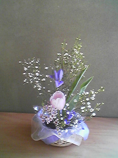 卒業式の時貰ってきたチュウリップとかすみ草・ ワックスフラワー と一緒に活けました。
