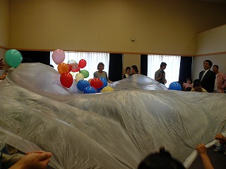 シートが波のようになり、風船を落とさないようにシートを引っ張り、波の下を潜る子供がいたり、思わぬ発見があり、子供たちの楽しい笑い声に包まれました。