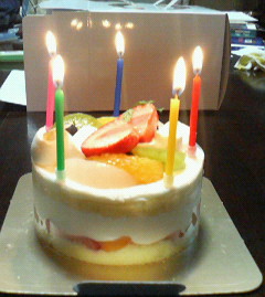 母親が仕事帰りにケーキを買ってくるらしいです。多分、ショートケーキを人数分買ってくるのだろう…と思うのですが、同じ買うなら、円形にして欲しいと思っています。お店の人に…「すいません!ろうそく35本ください」母親は決してこんなこっぱ恥ずかしいことを言えるはずがありません。でも、娘のためなら、言って欲しい気もちょっとします。::それからそれから!:さっき、母親が帰宅しました。小さな円形のケーキを買ってきました。お店の人に「ろうそくください」と言って、「何本いりますか?」と聞かれたらしく「5本です」と言ったそうな。10の位は割愛されてしまいました。今日だけは「5歳」です(笑)。あとは何もなさそうなお誕生日。宴はちびっと例の日本酒を呑む位かな。今晩は「うどんすき」だし…。明日以降に買ったお洋服の代金にお酒代を入金しないといけない。…思いっきり「現実」に戻っています。トホホ。