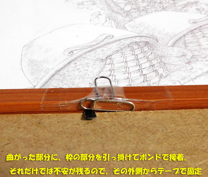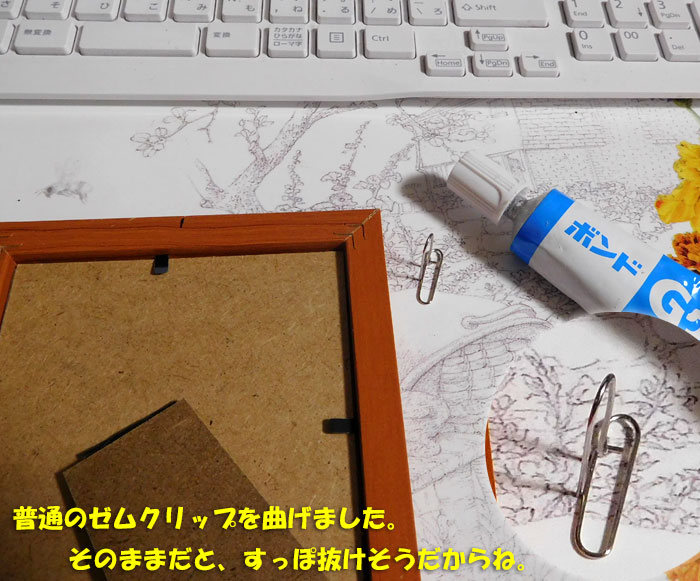 というわけで、クリップをラジオペンチでまげて、吊り下げ金具にしましたよ。
