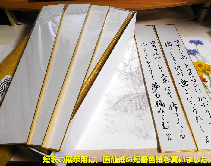 画仙紙の短冊型色紙です。二枚ずつ包装されているので、面倒だけど、汚さずにすみますね。