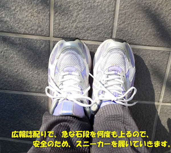 薄紫色のスニーカーをはいて、さて、出発です。