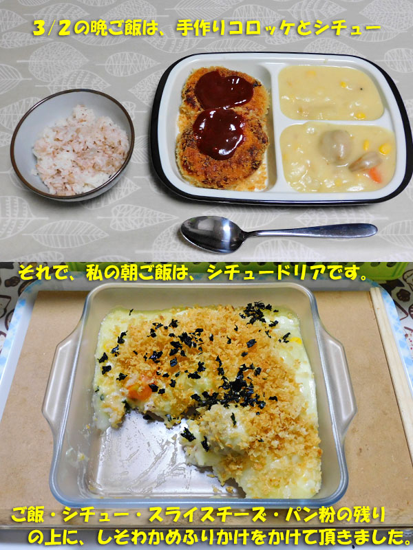シチューは、前日の残り。かけたパン粉は、昨日炒めていた物の残り。