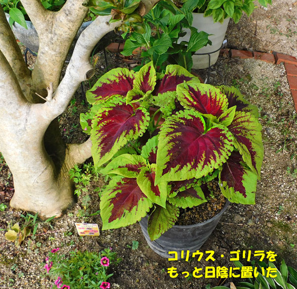 ​寄せ植えのコリウス​ は、全体が大木の八重桜の木陰に入っているから、