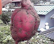 美味しいさつまいもの時期になりました。幼稚園の芋ほり遠足は雨のため延期になってしまいましたが、らくちゃんの実家でお芋ほりしました。収穫したさつまいもはかぼちゃ?と思うくらいの太い?サツマイモです。取れるお芋すべてこんな感じ。「どうしてかしら?」 と、ばあちゃんは首をかしげる。まいこは・・・とても面白がって、いくつも掘っていました。収穫したサツマイモ。まずは、サツマイモのごはん(定番メニュー)にして頂きました。次に、サツマイモのプリンに挑戦しようかと考えてます。(レシピはないのですが・・・何でも挑戦です!!)