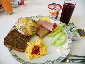 やっとお食事です朝たくさん食べたのでおなか空いていないのですけどねこちらでいただきます前菜ミートローフのようでしたポーランド風ロールキャベツゴウォンプキ豚ひき肉と野菜と米も入っていますやさしい味ですにんじんの千切りはにんじんの甘味と酸味がありますジャガイモはこれから毎日、毎食いただくことになりますデザートはりんごのケーキです外がサクサク素朴なケーキです