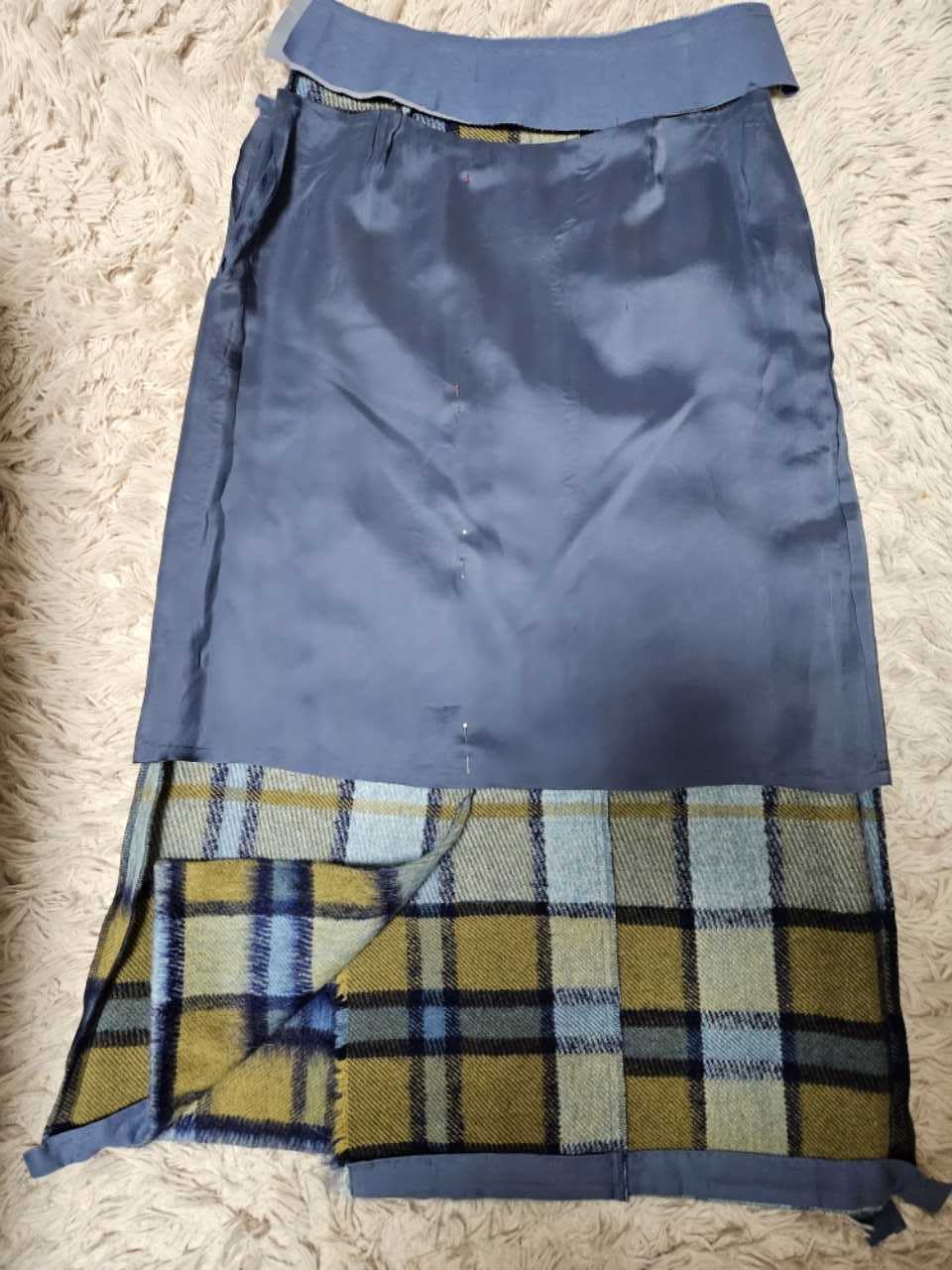 見返し、裏地、そして前後ろスカートもほどいて、スカート端をそれぞれ1cmちょいずつロックミシンで切り落とし、とりあえず、両脇縫ってほどいたファスナーをつけるところまで。
