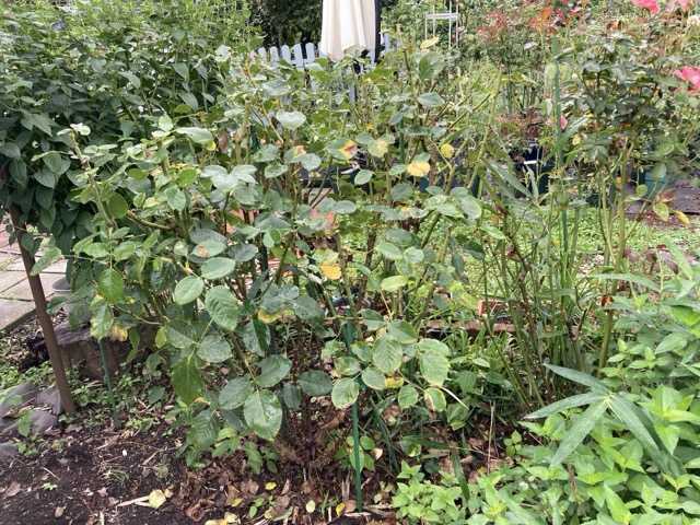今日で9月も終わり急に涼しくなって空調服もいらなくなりました風が気持ちよく吹いて庭仕事もしやすいです♪今日は薬剤散布から前回と違う薬剤にフルボ酸を入れて8ℓを充電式電動スプレーを買ったので今回はバケツのまま使用です5mのホースがついているので重い水の容器を肩からかけずにノルズ部分だけ持って散布できます電動なので圧をかける必要もありませんなんて快適なのでしょう☺️先端スプレーも3種類ほどついていて交換できるので少し拡散が大きくたくさん噴霧できるものでやってみましたすごく快適です5mのホースは思ったよりも広範囲に噴霧できてタイプCでの充電は2時間ほど持って途中で切れることなく終わりました値段も安かったのでお試し購入のつもりでしがとても良い買い物でした潰れずに長く使えると嬉しい😊ですが・・・秋になって色も綺麗に薔薇が咲いてきましたたくさんついた新しい葉が広がってきています蕾がついてきているものもあってこの時期の薬剤散布はとても重要ですね茎の葉が落ちてスカスカになってしまったハマギク中央部が白く膨らみ始めました2年目です去年は10輪ほどしか咲きませんでしたが今年は3倍ほど大きくなりました茎の葉っぱは去年の方が多かったですが😜横から見ると先だけで頑張っているように見えて結構不思議な感じの花に見えます孔雀草も咲いて花壇が少し秋🍂になってきました