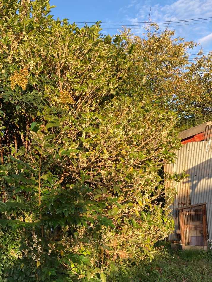 台風の心配をしていたらいつの間にかそれていました今日は秋晴れでも風が強いやっぱり台風の影響でしょうね屋敷への入り口道路に面した花壇が凄いことに🙈はい、見て見ぬ振りをしてましたm(_ _)mこの稲科の植物はなんでしょう?一人では大変なので夫に手伝ってもらしました壁にへばりついていた蔦を取って薔薇も剪定手伝ってもらったので2時間ほどで終了ありがとう٩( ᐛ )و裏庭の金木犀が咲きましたいい香りです(๑>◡<๑)表では銀木犀が裏では金木犀がそれぞれとてもいい香りが漂います秋ですね🍂