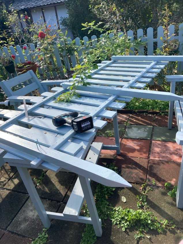 2年ほど前にコメリで購入したピケットフェンス使い終わりで1枚残っていましたこのフェンスは防腐剤処理をして販売されていますが軒下保管で心配だったので白のペンキを塗装していましたずーっと気になっていたフェンスを薔薇のフェンスとして栗の木と花壇の境に立てることにしまいましたとりあえずブルーグレーの塗装から久しぶりのペンキ塗りですお天気も良く風も吹いているのでとても早く乾いて調子いいです支柱は3本これも防腐剤を塗って保管していたのでペンキを塗るだけで済みました午後は途中まで切っていた琵琶の木の伐採です先日購入したチェーンソーが活躍していますが幹が太いので大変そうです輪切りにした木は防腐剤処理をして花台にするのも良さそうですちょっと考えてDIYしてみよう💡少しまとまって薔薇が咲いてきました庭が華やかになってきますね🌟夏薔薇に比べて花びらの数が増え色も鮮やかになって咲いています明日は息子に手伝ってもらってフェンスを立てます(^з^)-☆