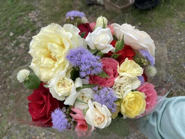 台風が接近中🌀明日の午前中に一番近くなるようです今日はまず夕方来られるお客様のために花束作りから薔薇のアクセントに紫のフジバカマを入れてみました可愛くできているかしら?喜んでくれるといいな❣️そして野菜の収穫です瓜にナス🍆にシシトウピーマン🫑にオクラに万願寺とうがらし台風で枝が折れたりしないよう実を収穫したり支柱をたてたりして作物を保護しますオレガノとミントが暴れる入り口横のハーブガーデンです自生のニラに花まで咲いて草と一緒になってボウボウですミントを抜いてオレガノは短く切って草を引くとほとんど土ですギジタリスのこぼれ種から発芽して苗が育ってました台風が過ぎたら肥料をあげましょうもう1箇所母屋前の花壇ですここも日に日に草に汚染されてくるのが気になっていた所ですスッキリ綺麗になりました切り戻したサルビアが白と紫の花をつけて可憐に咲いています種から宿根になって3年目です宿根草は枯れたようになっていても春に芽を出して花壇を華やかにしてくれるので大切な花です今年春に手前に植えた撫子も種からの宿根草です暑さで白くなったりしていましたが最近元気になって上に広がってきまし秋に花を咲かせるのでしょうか?もしそうならワクワクです😄どちらの花壇も今日は水やり無し台風の雨待ちですたっぷりもらって大きくなってもらいましょう今回の台風は明日の明け方から強くなるようです皆さん気をつけて出勤してくださいね👋
