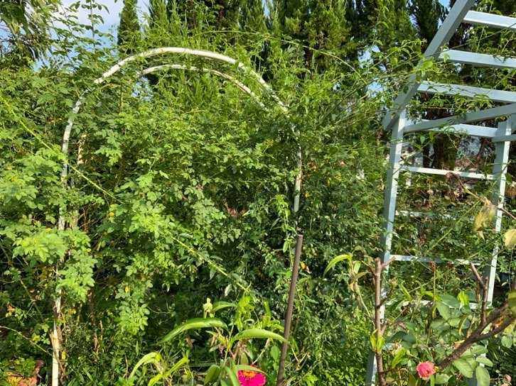 秋薔薇のための肥料が終わりました後は10月中旬の開花を待つばかりです♪新芽が上がってきて生き生きとしています大きさの確認と置き場所を決めるために5月に買ったトンネルアーチを組み立てて見ることにたくさんの棒やねじ釘が入っています園芸だけでなく果樹や野菜にも使えるように緑色も網まで付いています息子に手伝ってもらって説明書を見てアルファベット記号の部品を組み立てていくはずが🤨もう説明書の字が小さくて早々にお手上げ横にいるだけでは仕方がなので結局丸投げ٩( ᐛ )وはい完成‼️👏👏👏もっと裾が広がっているのかと思ったらかなりスマートでシュッとしています強度はどうでしょうか?アーチより奥行きがあるので土に埋め込むとガッチリとするのでしょうねついでに草を刈ってくれましたスッキリ綺麗です🤩草むらから蚊🦟がいっぱい飛び出して首筋をたくさんかまれてました可哀想😢そばにいる私は全然かまれませんでしたけどねΣ('◉⌓◉’)