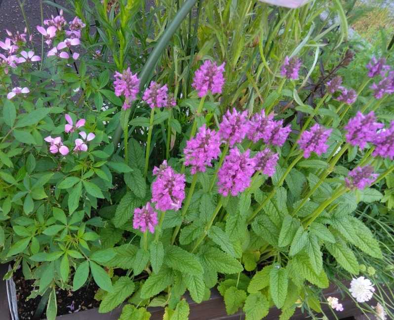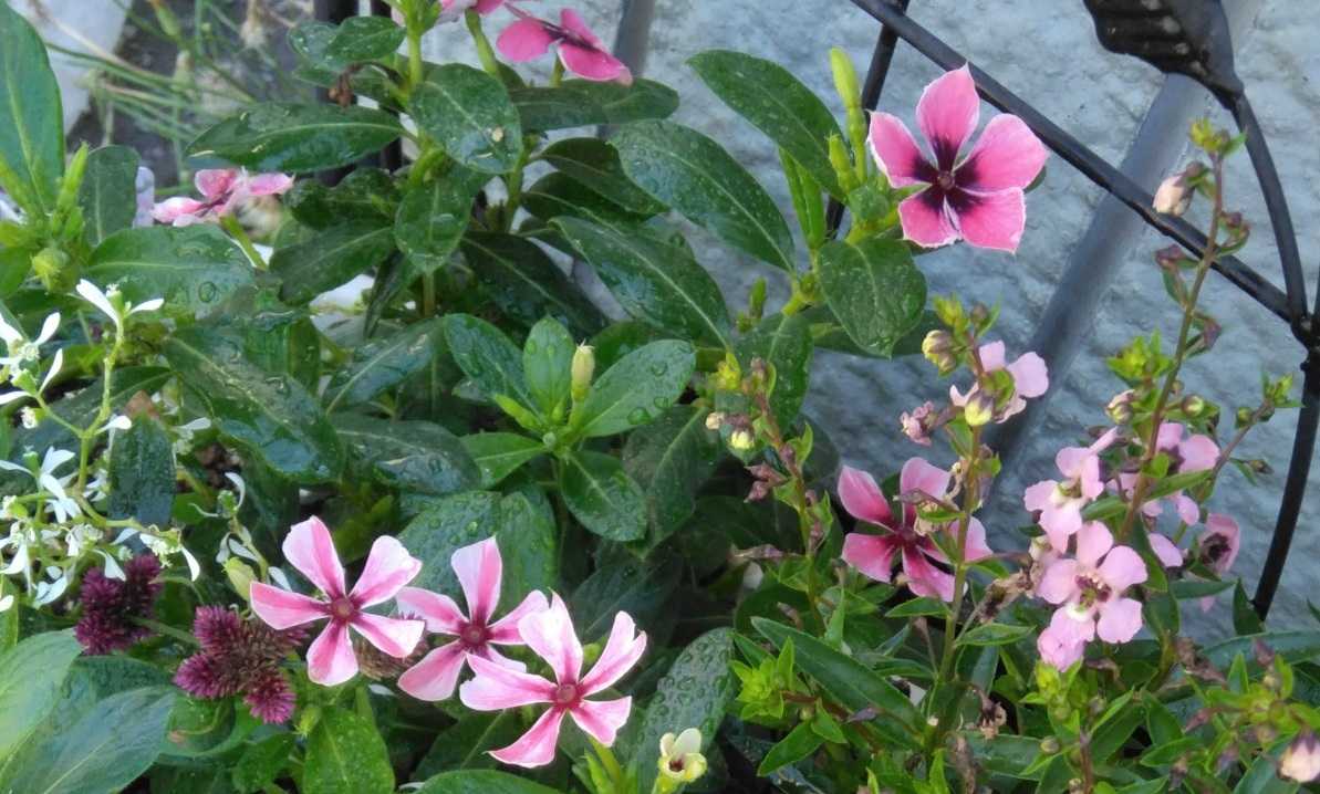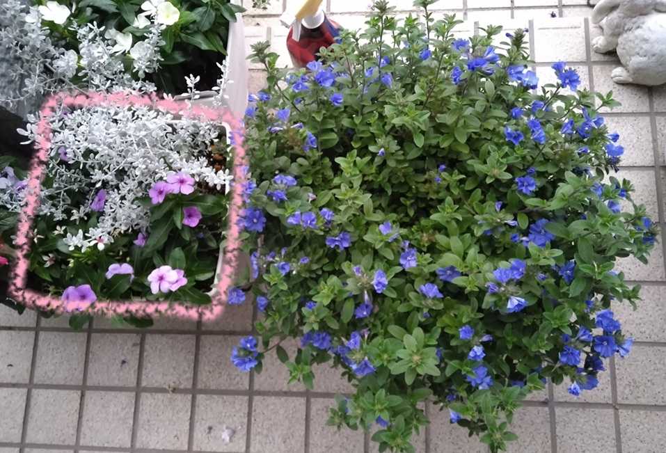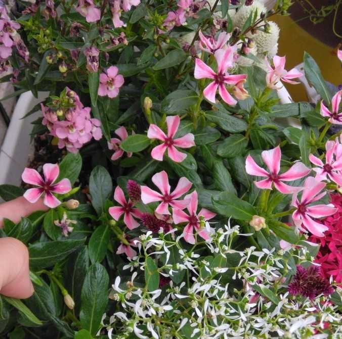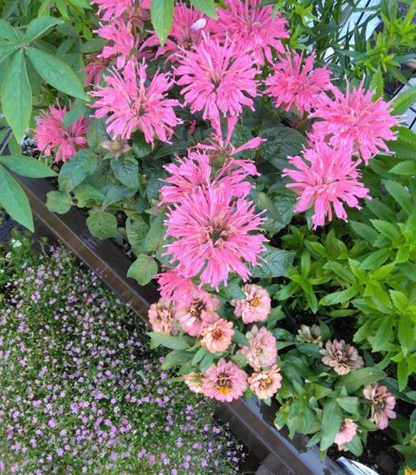 後ろに見える線の細いのはカラミンサで、別鉢に植わってるのを並べてるだけなんだけど