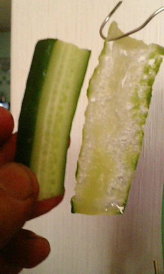 下の画像は食事前と10時間後のキュウリです。(ペラペラになってました。)