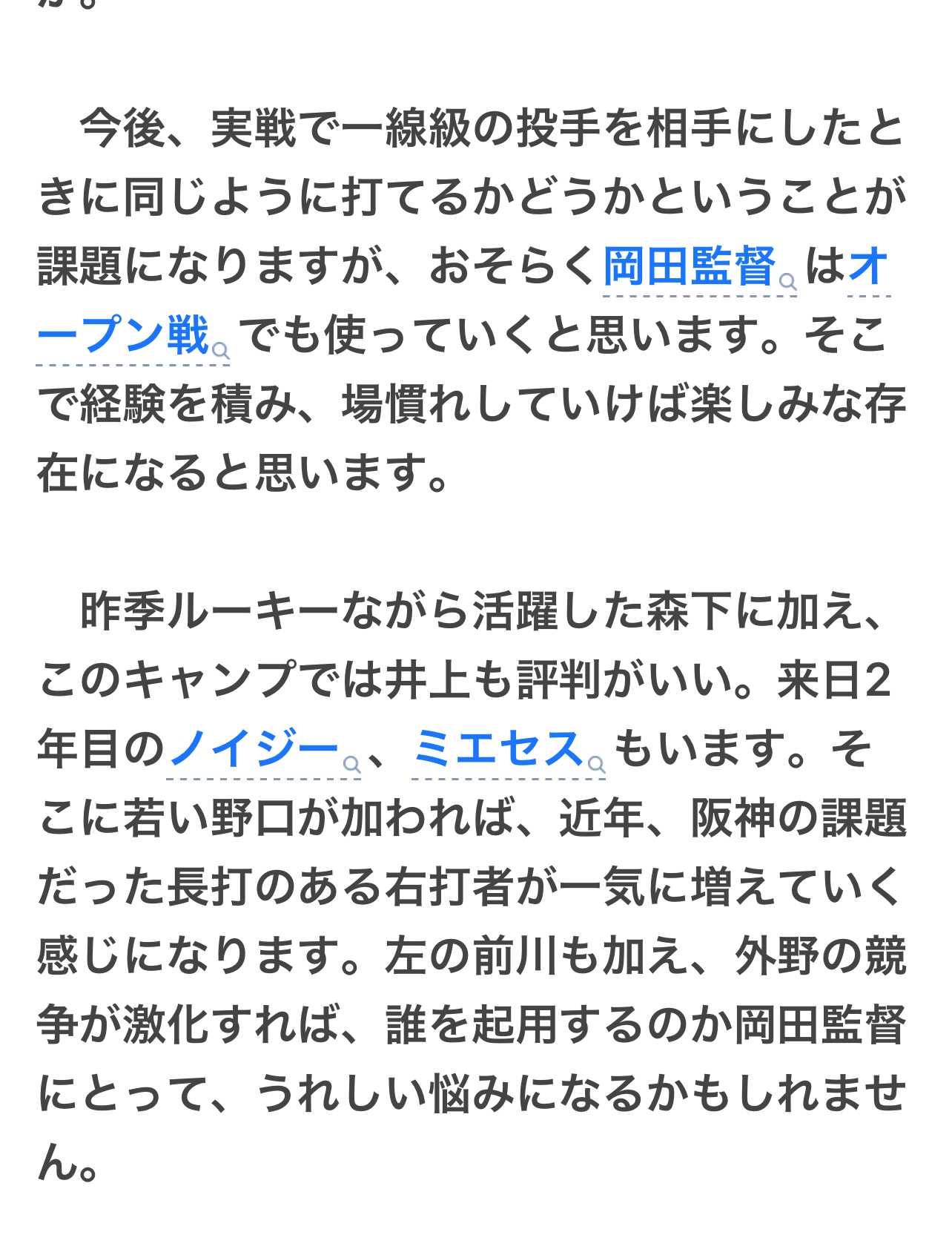 阪神タイガースの外野は基本的には近本選手、森下選手、ノイジー選手だと思います。