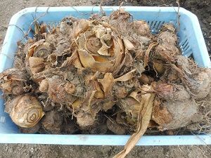 先日、里芋を収穫し中から大きい里芋と親芋を80センチぐらいの穴を掘り