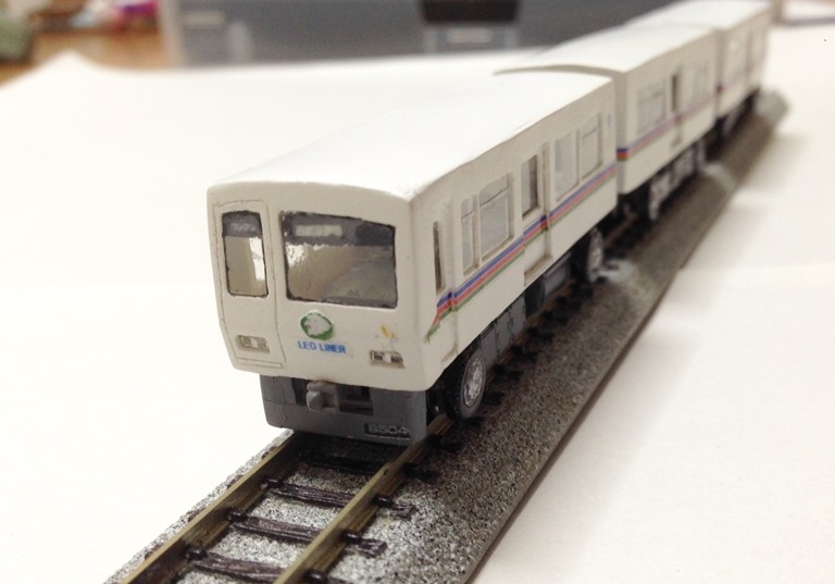 前面、側面はプラ板、屋根はGMの東武8000系を利用して製作しました。下回りはKATOの貨車を使用し、動力も組み込んでいるので自走します。塗装は白をスプレーで塗装後、帯には自作ステッカーを貼りました。着想から完成まで約10年かかった車両ですが、その分愛着も湧く車両です。