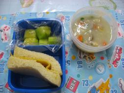 本日のお給食食パンセルフサンドクラムチャウダーメロンクラムチャウダーたまねぎの薄切り、にんじん、ジャガイモのいちょう切り、グリンピースを鍋に入れ、塩をぱらり、ヒタヒタの水で煮る。やわらかくなったら火をとめ、剥いたアサリとゆで汁 野菜ブイヨンと水で溶いた米粉とくず粉をいれ、再び火に掛けてとろみをつける。アサリなしだと、立派な?ホワイトシチュー。野菜の甘みがほんとにおいしい母のお楽しみ。やってみたかった豆腐ソフト。ちょっと失敗。でも、手作りイチゴシロップかけたら、うまかった