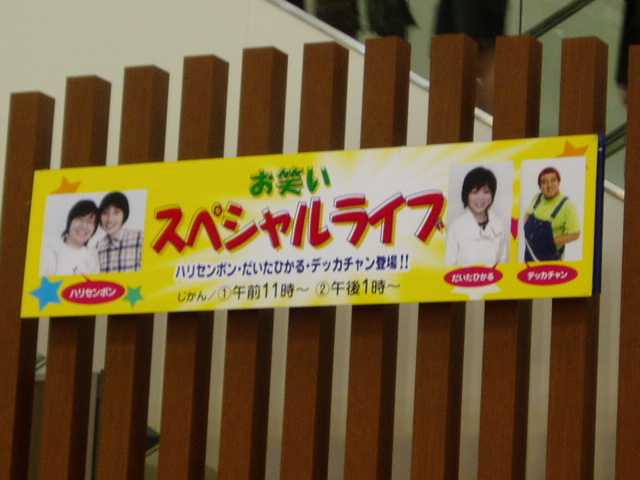 今日も朝から、「アリオ」に行って来ました。今回は、11時と1時で早いので。1回目は、だいたひかるとハリセンボン。どうにかぎりぎり座って見れました。子供は、いまいちだったようです。だいたひかるは、声が小さくて・・・・。2回目も並びました。2回目は、デッカちゃんと、ハリセンボン。2回目のほうが面白かったです。デッカちゃんは、子供も声を出して、うけてました。分かりやすいねただからね。まあ、やっぱり、お笑いも生が良いね。