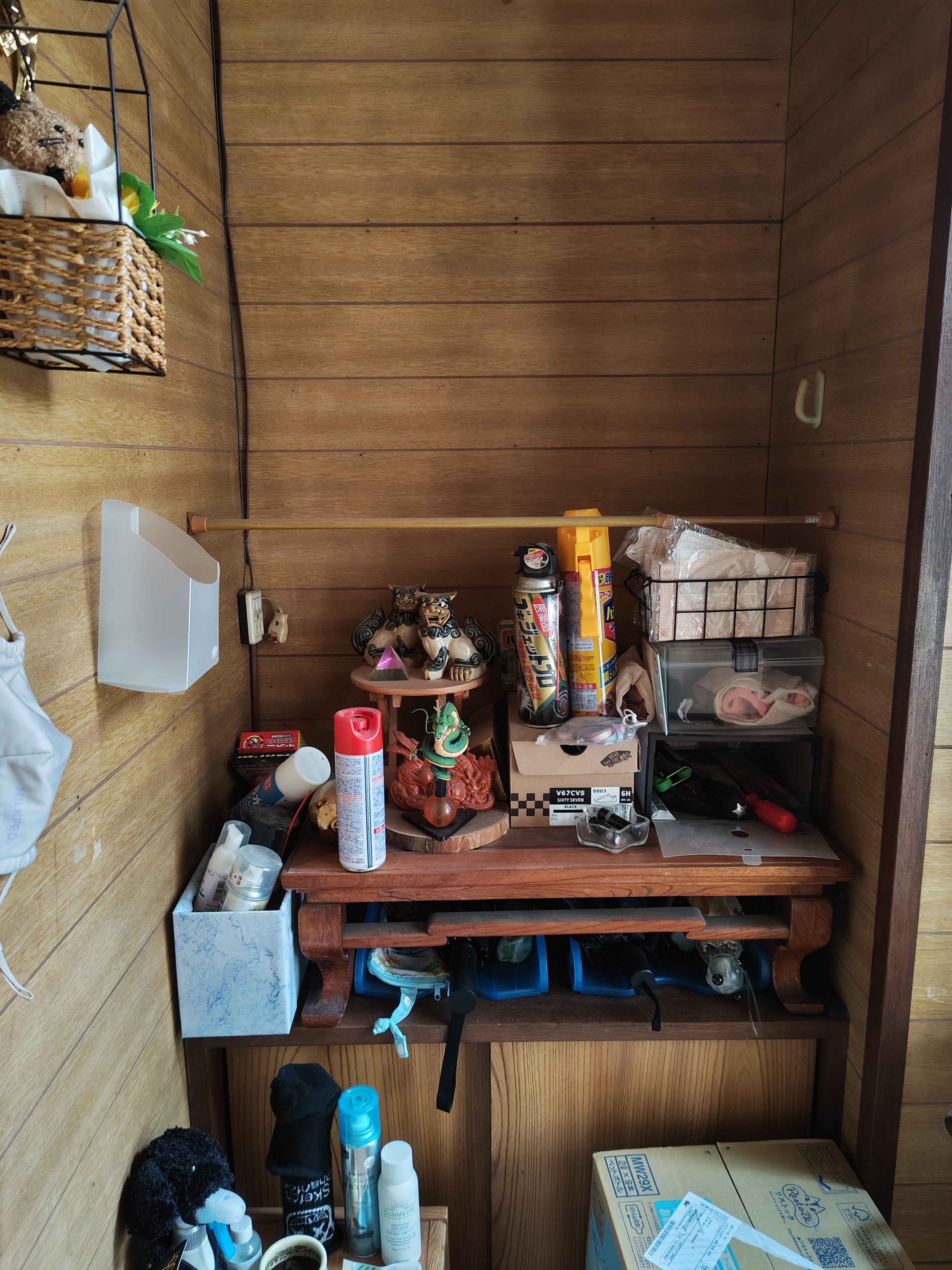 動くうちに、家の改造計画をしてしまわなければ。今月は玄関をやってます。娘の靴も居るのは押し入れ。要らないのは売る、出品終わりました。そして玄関まわりの片付けと収納見直しです。下駄箱と下駄箱の上を今日やりました。家にあるもので変えなくては。まずいままでの。ごちゃごちゃ。見栄え悪すぎ。ザ!昭和レトロです。台は売ってみよう。花台っていうのかな?真中の下駄箱の上。父はここに盆栽とか置いてました。剥げてるけど、塗りなおせばね。いる人いるかな?それを撤去して、カラーボックスに。ニトリの2段のがピッタリでした。簡単に収納したところ。まだ仮です。両サイドは縁があって隙間がありますが、ピッタリでした。そしたら下駄箱の前にあったむかしからのカラーボックスは不要に。開けやすくなった。まだ家庭菜園クッズが外に出てますが、下駄箱に入りそうです。ちょうどよい段ボールを後で探します。カラーボックスの下は滑り止めマットをひきました。昭和レトロは代わりませんが。さあ、次はカラーボックス取り替えたので、取り替えた先の収納もしなくては。暫く猫たちが遊んでます。二階建てだ!って。とにかく今は、要らないものを、撤去し、あるもので何とかする。リメイク?DIYはその次ですね。やはり花があるともっと良いんだろうな。やっとマリーゴールドが種から花が咲きましたよ。今日のベランダ菜園。そしてマリーゴールド。