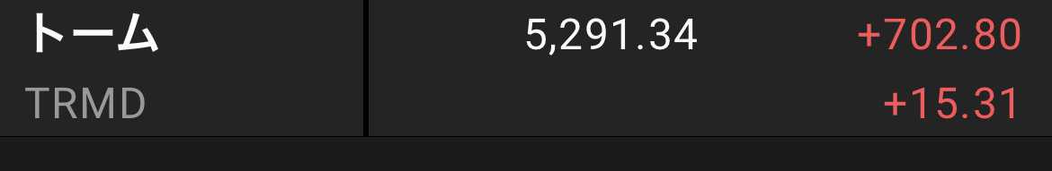 下げたので買い増ししたTRMDプラスになってますこの調子で上げていくといいんですけど当面はホールドしときます10倍くらいにならないかなぁFIREしたい病です