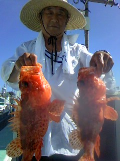 外房大原港~ 鬼カサゴに出船しました (^^)v 始めのポイントは大原沖 ε=┏( ・_・)┛ 水深は140m~150mを狙いました (^^)v が 1kg サイズ 1匹 (;^_^A サメの猛攻撃に合いました (>_<) すぐに場所移動 ε=┏( ・_・)┛ 次のポイントは岩船沖 ε=┏( ・_・)┛ 水深は180mを狙いました (☆。☆) そのポイントで 発見 (☆。☆) 鬼の巣 ☆彡 来ました~ \(^O^)/ 2kgクラスの鬼カサゴ \(^O^)/ しかもカンコも3匹(大きさ2kg~3.6kg) も釣れました (^.^)b 潮がちょうど良く流れ ☆彡 最高の条件でしたね (≧▼≦) これから楽しみです (^.^)b 。 明日・9月21日の火曜日は 一つテンヤのシャクリマダイに出船いたします (☆。☆) 今のところ2名のお客さんから予約を頂いております m(__)m 大原港は 祭典の為 23日~26日までお休みとなります (^.^)b よろしくお願いします m(__)m 今後の釣り物予定です ………↓……… メインで 釣って頂いたスルメイカを餌に 【スルメイカ生き餌の泳がせ釣り】 と 外道も楽しめる 【鬼カサゴ】 に出船いたします。 p(^^)q いずれも10名までの乗船とさせて頂きます m(__)m ご予約お待ちしております(^.^)b お客さんへのお願いです m(__)m ………↓……… 勇盛丸では、常にお客さんの安全を考えて操業しております p(^^)q 【安全1番・楽しさ2番・最後に釣果はついてくる♪♪♪】《文明堂カステラのCMのパクリですが…(;^_^A》 をテーマに 命を預かる商売ですので、いつも慎重かつ冷静な操船を心がけております。 その為には、お客さんのご協力が必要不可欠ですので…… 生意気な言い方かもしれませんが 海の上では、マナーと船長の指示を必ず守って下さるよう、お願いいたします m(__)m 。