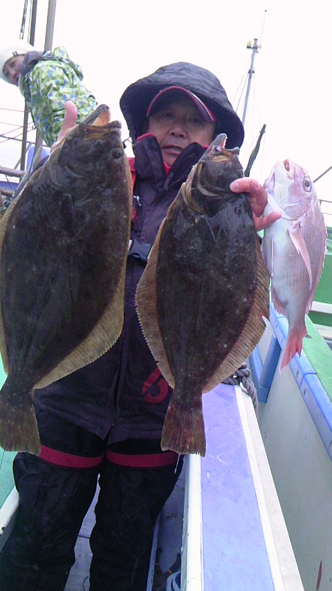外房大原港~ ヒラメ&一つテンヤのシャクリマダイに出船しました (^^)v 始めはヒラメです p(^^)q ポイントは大原港近く~岩船港近く ε=┏( ・_・)┛ 場所に着くと………………… イワシ群発見 (☆。☆) 流し始めると ☆彡☆彡☆彡 来ました~ \(^O^)/ 大きさ3.5kgの大型ヒラメ (^^)v 続いて、大きさ2.1kgと1.3kgのヒラメをゲット (≧▼≦) その中で、大型ヒラメのバラしが3回ありました (T_T)/~ その後、イワシ群追いかけて ε=┏( ・_・)┛ 投入するも……… (☆。☆) 残念ながら、当たりはありませんでした (T_T)/~ 10時にからは一つテンヤのシャクリマダイです p(^^)q ポイントは岩船 ε=┏( ・_・)┛ 場所に着くと……………… またまたイワシ群発見 (☆。☆) 釣りはじめるも……………… 小サイズのマダイと 外道で ショウサイフグ ウマズラ のみ (T_T) 風が強まってきたので、広範囲を探れずに……………… (>_<) 苦戦 (??????@;) このまま、良い所なく (;^_^A 時間となりました (T_T)/~ 出船予定です ………↓……… 明日・12月31日の大晦日は ヒラメに出船いたします p(^^)q 今のところ5名のお客さんから予約を頂いております m(__)m 年明け・外房大原港の遊漁船は 1月5日が初出船です (☆。☆) 1月7日の土曜日は 一つテンヤのシャクリマダイに出船いたします (≧▼≦) 今のところ4名のお客さんから予約を頂いております m(__)m その他の日はまだ予約が入っておりませんので (;^_^A 出船予定の日も含め、乗船のお問い合わせを、お待ちしております m(__)m 今後の釣り物予定です ………↓……… メインでヒラメ その他 一つテンヤのシャクリマダイ オニカサゴ にも 出船いたします。 ご予約お待ちしております m(__)m 尚、ヒラメの乗り合いは12名までとさせていただいておりますので、ご了承ください m(__)m お客さんへのお願いです m(__)m ………↓……… 勇盛丸では、常にお客さんの安全を考えて操業しております 【安全1番・楽しさ2番・最後に釣果はついてくる♪♪♪】《文明堂カステラのCMのパクリですが…(;^_^A》 をテーマに 命を預かる商売ですので、いつも慎重かつ冷静な操船を心がけております。 その為には、お客さんのご協力が必要不可欠ですので…… 生意気な言い方かもしれませんが 海の上では、マナーと船長の指示を必ず守って下さるよう、お願いいたします m(__)m