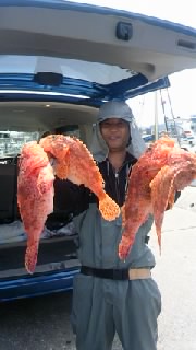 外房大原港~ オニカサゴに出船しました (^-^)v ポイントは御宿沖~岩船沖 ε=ε=(ノ≧∇≦)ノ 水深は130m~100mを狙いました p(^^)q 潮が速かったのですが 仕掛けの立ち良く (^^) 朝の流しでボーズ無し d=(^o^)=b 外道も宝庫で (^^)v 大きさ2.0kg~3.5kgのカンコ が船中 12匹 (^^)/ アヤメカサゴ ノドグロカサゴ オキメバル もちろんオニカサゴも釣れ クーラー満タン \(^.^)/ いい釣行となりました d=(^o^)=b 出船予定です ……↓…… 明日・7月12日の金曜日は lightタックル・イサキ&アジに出船いたします p(^^)q 今のところ3名のお客さんから予約を頂いております m(._.)m 7月13日の土曜日は イサキ&五目に出船いたします d=(^o^)=b 今のところ8名のお客さんから予約を頂いております m(._.)m 7月14日の日曜日は 一つテンヤのシャクリマダイに出船いたします 今のところ5名のお客さんから予約を頂いております m(._.)m 7月21日の日曜日は イサキ&一つテンヤマダイに出船いたします d=(^o^)=b 7月22日の月曜日は オニカサゴに出船いたします (^^)v 今のところ2名のお客さんから予約を頂いております m(._.)m その他の日は、まだ予約が入っておりませんので (´д`|||) 出船日も含め、乗船のお問い合わせを、お待ちしております m(__)m 問い合わせは 090 2932 3575 0470 62 2086 までお願いします m(._.)m 大原港の優漁船の休日は、第一・第三の月曜日です ゜゜゜゜゜-y(^。^)。o0○ お知らせです ……↓…… お客さんへのお願いです ……↓…… 勇盛丸では、常にお客さんの安全を考えて操業しております 【安全1番・楽しさ2番・最後に釣果はついてくる♪♪♪】《文明堂カステラcmのパクりですが………(^-^ゞ》 をテーマに 命を預かる商売ですので、いつも慎重かつ冷静な操船を心掛けております その為には、お客さんのご協力が不可欠ですので 生意気な言い方かもしれませんが 海の上では、マナーと船長の指示を必ず守ってくださるよう、お願いいたします m(._.)m