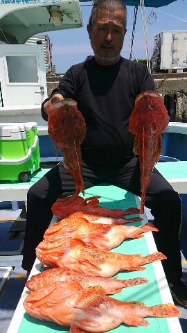 外房大原港~オニカサゴに出船しました(^^)vポイントは岩船沖ε=ε=(ノ≧∇≦)ノ水深は140m前後を狙いました( ☆∀☆)潮が速くて………………(・・;)一流し目は空振り(>_<)その後は仕掛けの入りが良くなり(^^)v2.0kgクラスのオニカサゴがバタバタと釣れて\(^-^)/その他大きさ3.0kg~3.5kgのカンコとメダイ も釣れました(^^ゞ時間までに大きさ0.8kg~2.5kgのオニカサゴを1匹~8匹(^^)v全員、鬼カサゴを釣ってくれましたm(._.)m出船予定です…………↓…………明日・5月31日の火曜日は鬼カサゴに出船いたします(^^)v今のところ4名のお客さんから予約を頂いておりますm(._.)mその他の日は、まだ予約が入っておりませんので(^_^;)出船の日も含めて、お問い合わせをお待ちしておりますm(._.)mイベントのお知らせです………↓………7月3日の日曜日 テンヤマダイ釣り大会開催\(^-^)/(上州屋&hayabusa cup)受付開始しますd=(^o^)=b勇盛丸は定員12名で募集させていただきます(^^)v今のところ10名のお客さんから予約を頂いておりますd=(^o^)=bお問い合わせお待ちしておりますm(._.)m お知らせです………↓………探見丸 スマホ対応アンテナ搭載しましたシマノ探見丸 スマートフォンで見る事が出来ます無料アプリ配信中です(^^)v勇盛丸では、ライトタックル・イサキをメインに出船p(^^)q鬼カサゴ一つテンヤマダイまた希望によりオニカサゴのリレー釣り一つテンヤマダイのリレー釣りなどの企画もいたします(^^)v勇盛丸は、ジギング専門ではないのですが(;^_^Aジギングも乗り合いで楽しんでもらえたら、嬉しいですね(^^)bその他、お問い合わせは090 2932 35750470 62 2086までお願いいたしますm(._.)m大原港の優漁船の休日は、第一・第三の月曜日です(^_^)y-゜゜゜゜゜お客さんへのお願いです……↓……勇盛丸では、常にお客さんの安全を考えて操業しております【安全1番・楽しさ2番・最後に釣果はついてくる♪♪♪】《文明堂カステラcmのパクりですが………(^-^ゞ》をテーマに命を預かる商売ですので、いつも慎重かつ冷静な操船を心掛けておりますその為には、お客さんのご協力が不可欠ですので生意気な言い方かもしれませんが海の上では、マナーと船長の指示を必ず守ってくださるよう、お願いいたします