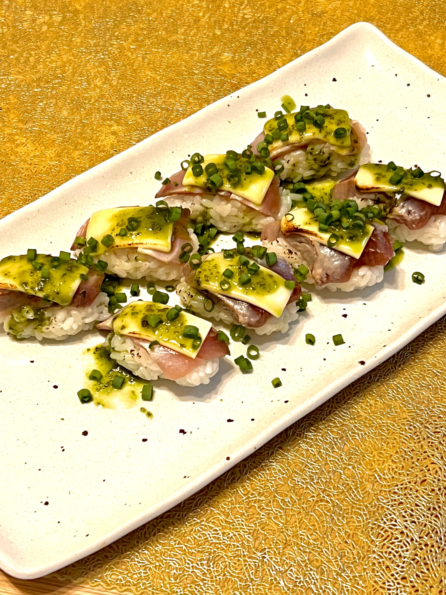 簡単♪刺身の残りで炙りバジルチーズ寿司☆作者: mucchi0601■材料(4〜6人分)刺身(サーモン、ブリ、カツオなど何でも) / 45枚くらい米 / 3合水少なめで炊く•お酢 / 大さじ5•砂糖 / 大さじ4•塩 / 小さじ1.5ジェノベーゼソース(バジルソース) / 適量とろけるスライスチーズ / 8枚(1枚で6貫分)万能ネギの小口切り / 適量■レシピを考えた人のコメントお刺身で飽きたらジェノベーゼソースとチーズで美味しいお寿司が出来ちゃう♡詳細を楽天レシピで見る→