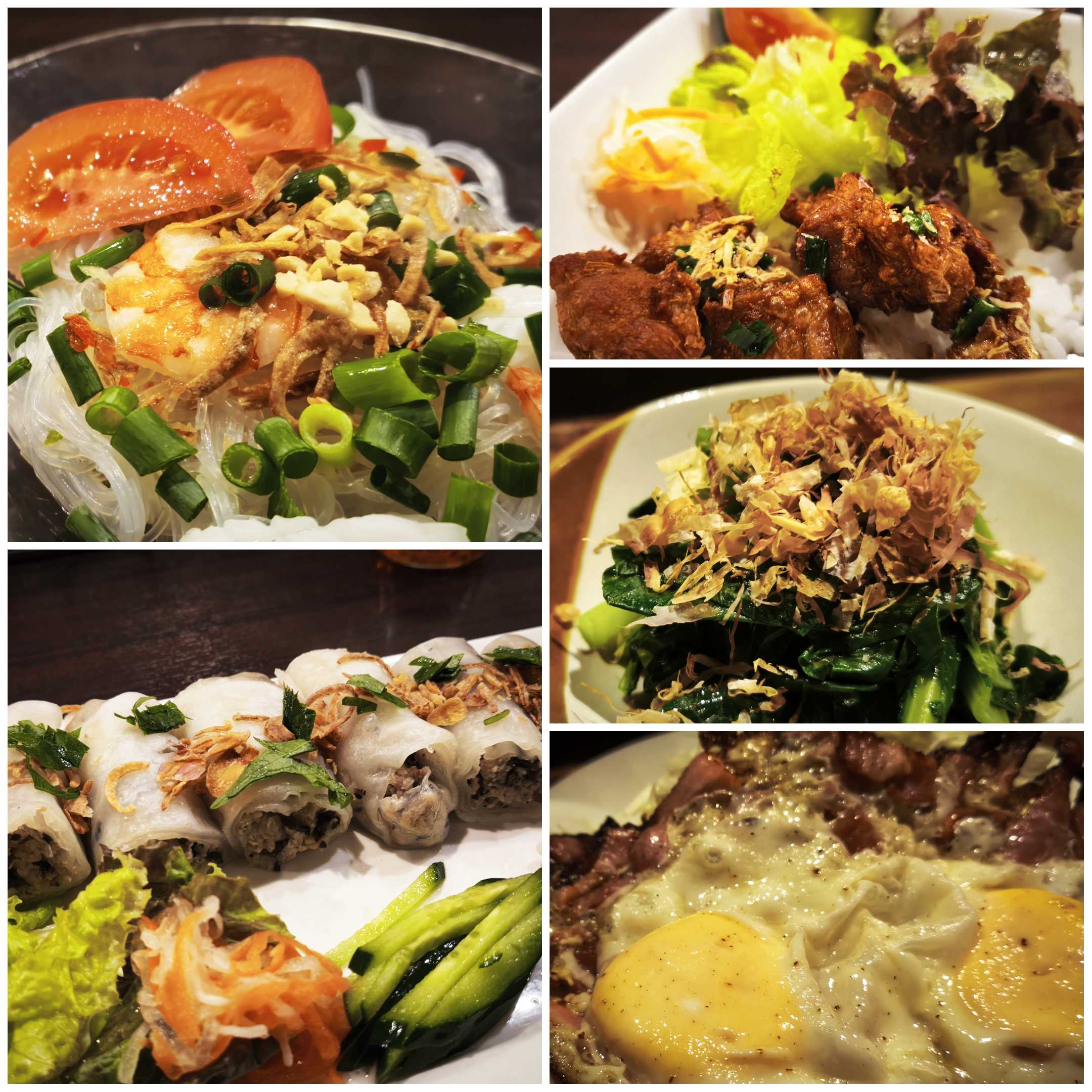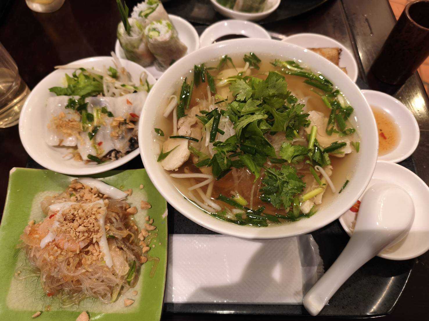配偶者とベトナム料理屋さんへランチパクチーと鶏肉のフォーシーフードと春雨サラダ蒸し春巻き追加の生春巻き揚げ春巻き