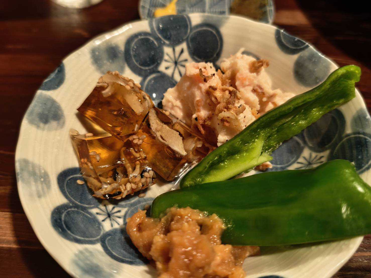 透析後に近所の居酒屋さんで配偶者とごはんお通しお通しオムライス