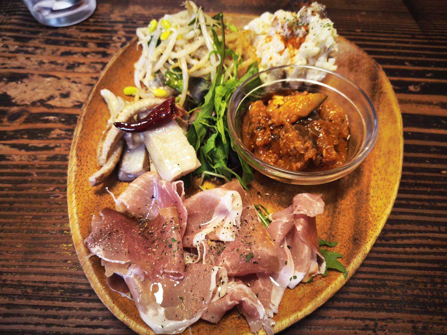 前菜盛り合わせピクルスサラダポテトフライフライドチキンお肉メガ盛り
