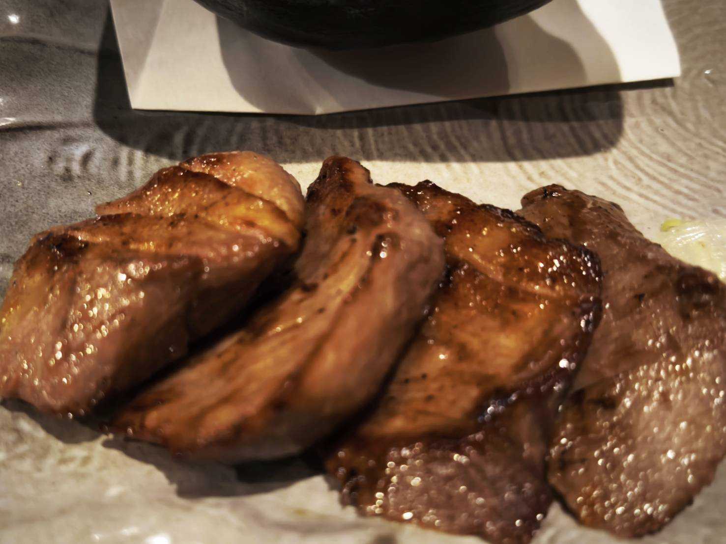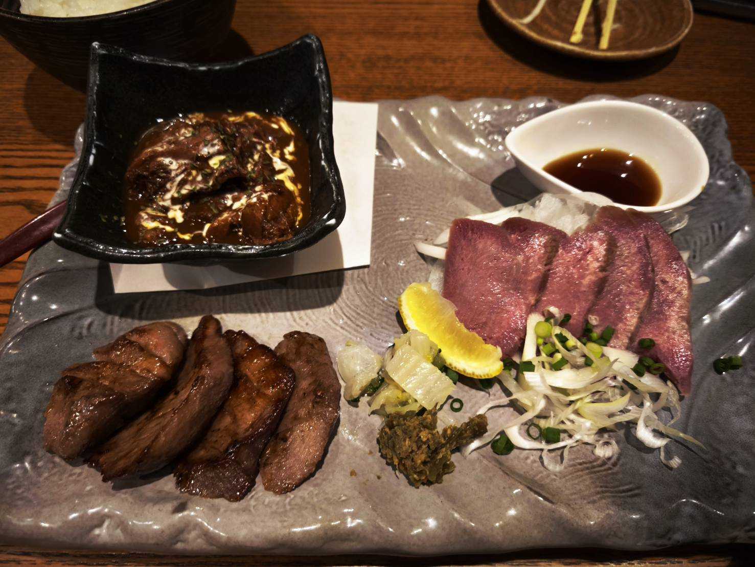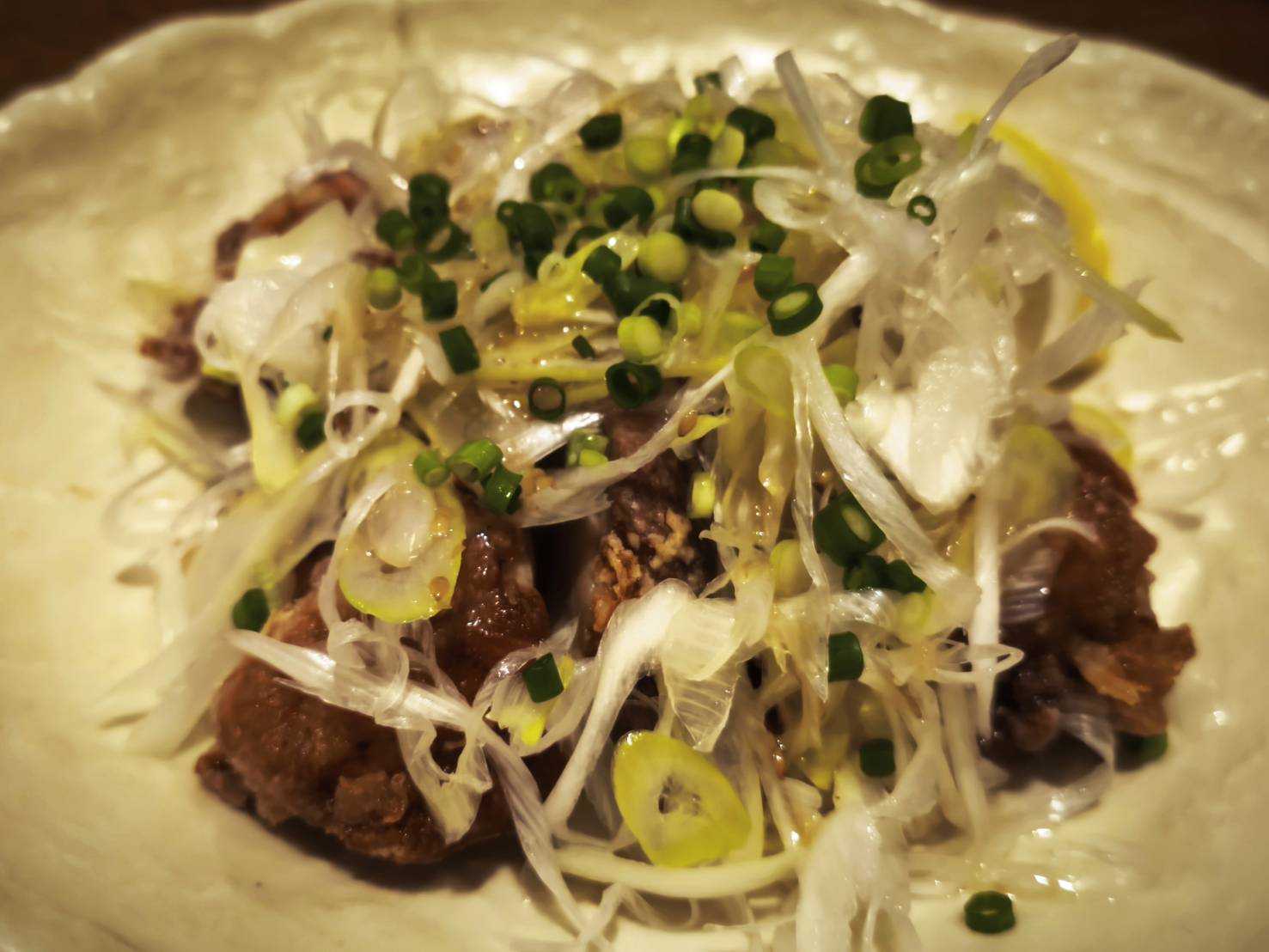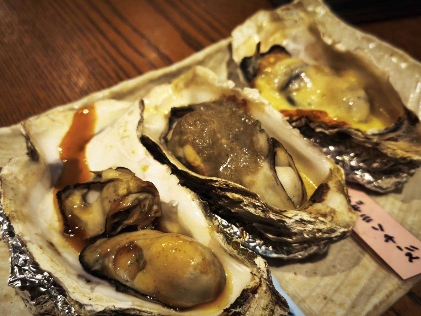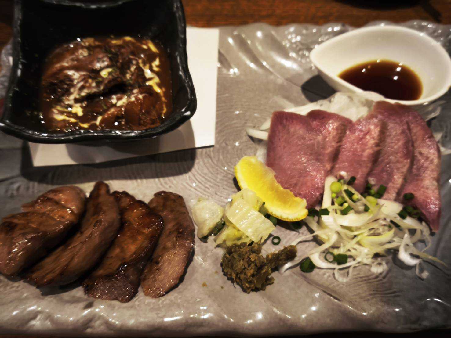 お通しポテトサラダ牛タン盛り合わせ牡蠣盛り合わせ茶そば鶏唐揚デザート