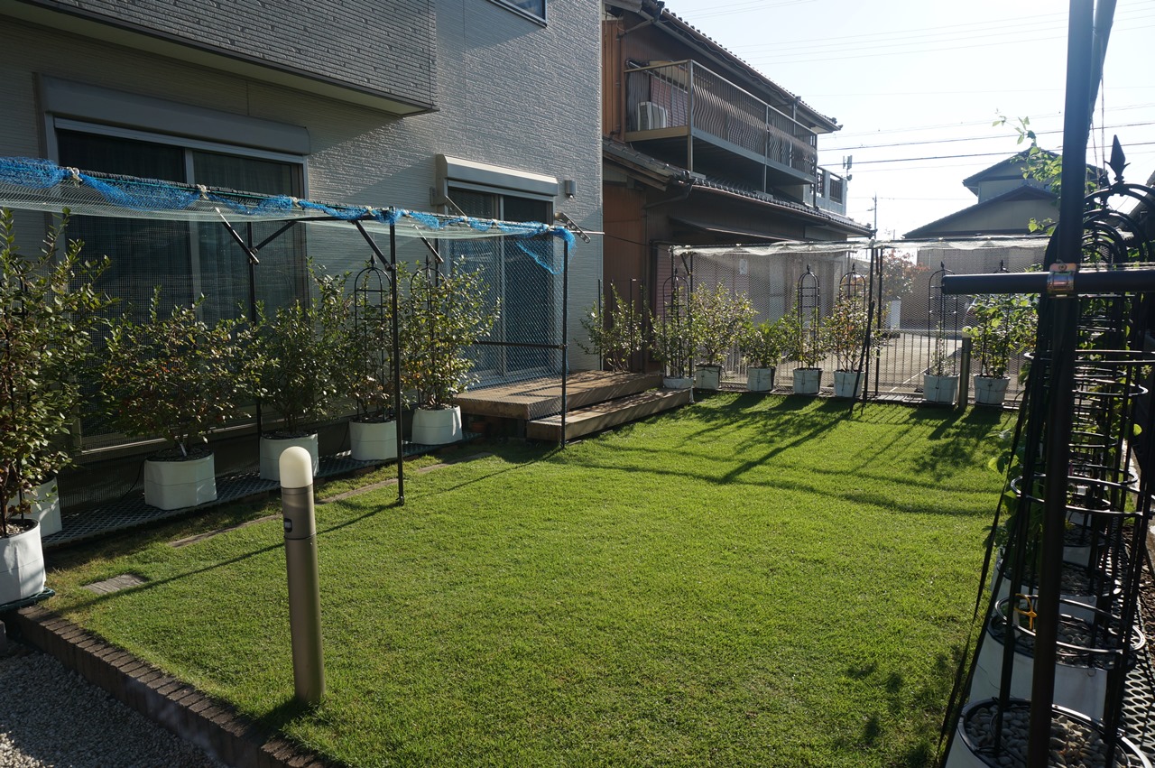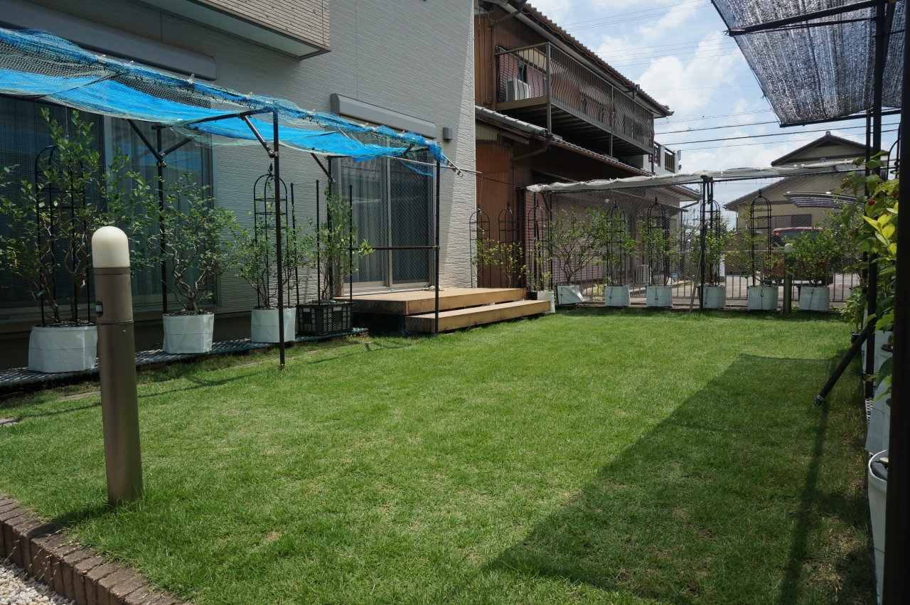 こんばんは^^ 毎日暑いですね。我が家ではベリー達の収穫が終わってから、少しづつですが夏の作業を進めてました。時間のかかる初夏剪定も先週末やっと終わりました。今年度も「上に伸びた元気な枝を大切にする」切り上げ剪定をベースとし、株下側の枝は光合成の補助・見た目を良くするため、混み合わない程度にバランス良く剪定し(しっかり葉を残す)、内向きの枝、下垂枝、短い弱小枝、地際からの細い枝、交差する枝、枯れた枝などを取り除きました。庭の東側は、ありものの防風ネットを二重にして遮光ネットとしました。二重だと結構遮光ができそうです(芝の影参照)。北側は遮光率60%のネットを設置。サイズが合わず、少し風通しが悪くなっていますが、夏の強い日ざしを遮ってくれてます。どんな効果が出るか楽しみです。遮光ネットがない場合は、鉢中は外気温と同じですが、遮光ネット内の鉢は、若干温度を抑えることができています。7月初旬から、新梢は「シャシャンボツバメスガ」にしっかりやられています。くやしい。。。が、なんともならん。。。続いて、収穫後に「トワイライト(左)」と「ユーリカ」を1鉢づつ、新用土への植え替えを実施しました。新用土への植え替えも、来年度には全て完了する予定です。昨年秋に新用土に定植した今年度3年生の株も順調です。こちらも昨年秋に新用土に定植した今年度4年生の株。劇的に成長しています。新用土も今のところ問題ないようです。旧用土の「ケストラル」。最初に初夏剪定し、すでにモサモサです。新用土の「OPI」。旧用土の「ヒューロン」。コンパクトな樹勢がステキです。旧用土の「スパータングロー(左)」「ドレイパー」。今年の夏は遮光ネット内に入れて、効果を確認してみます。新用土の「トワイライト」。新用土の「ユーリカ」。効果のあったスポット硫安潅水で、徐々に葉の黄化が回復してきています。旧用土の「ケストラル」。こちらもスポット硫安潅水をしていますが、回復せず。樹勢はあるので根はしっかり張っていそう。原因は根詰まりだと思います。来年度収穫後に新用土に植え替えます。新用土の「スノーチェイサー(左)」「メドラーク」。新用土の「ミスアリスメイ」。お試しでラズベリー用の支柱を使っています。上に枝を誘引するのが目的です。支柱があると楽ちんです。株が大きくなったら外す予定です。続いてラズベリー達。「キャンバイ」。上がすごい。。。「ナンタヘーラ」。秋果の花が咲いてきました。「ナンタヘーラ」は何とか枯らさないで栽培できるようになりました。「キャンバイ」。「ビンテージレッド」。まだ枯れていませんが、全体的にボロボロです。がんばれー。「コカニー」。暑さに強いのでしょうか、安定感ある生育です。当地もついに梅雨が明けました! しばらく水やりが大変ですが、楽しみな毎日です^^ 「いいな」と思ったら、応援お願いします!ぽちっとクリック。たぶん。--------------------------------------------------------------果樹菜園ランキングにほんブログ村