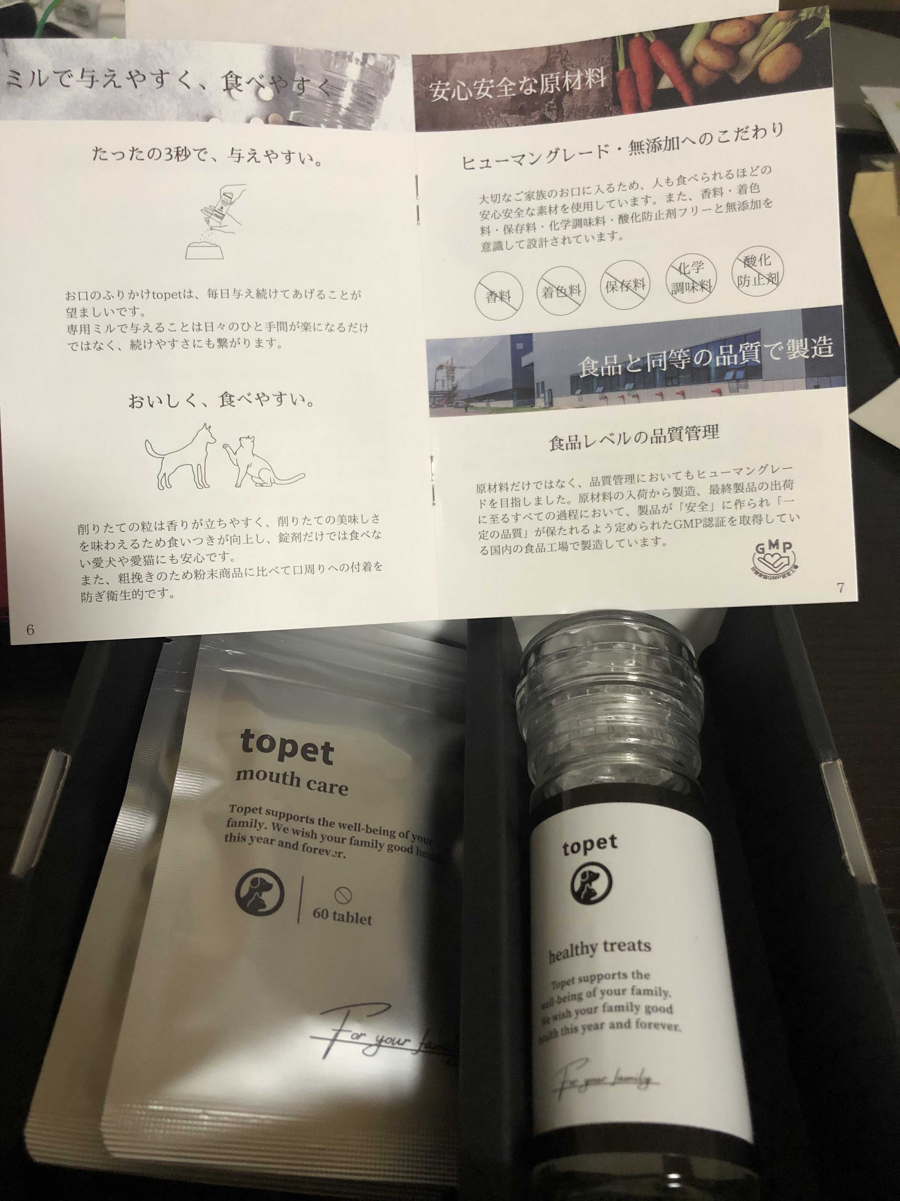 こんにちはm(_ _)m今日はお天気下り坂と思い、休みの日だけど愛犬の早朝散歩に行きましたが雨降らず・・・こんな日もあるわと思い偏頭痛で仮眠をしたら夢に会社のTOP3が出てきて・・・こんな日あるか?💢と思った午後です。「あるわ」と「あるか」語尾が違うだけで全く違うんだよね。ではでは、我が家の愛犬&愛猫たちのお話なんですが、中年~シニアが半数をしめてきましてものは試しとtopetさんから取り寄せました。外装も高級感漂うBLACK&GOLD箱を開けると、またまた高級感漂う・・・専用ミルとサプリが2袋入っていました。私はクラウドファンディングで購入しました。良ければ続けたいなと思っております。↓↓↓https://topet.jp/