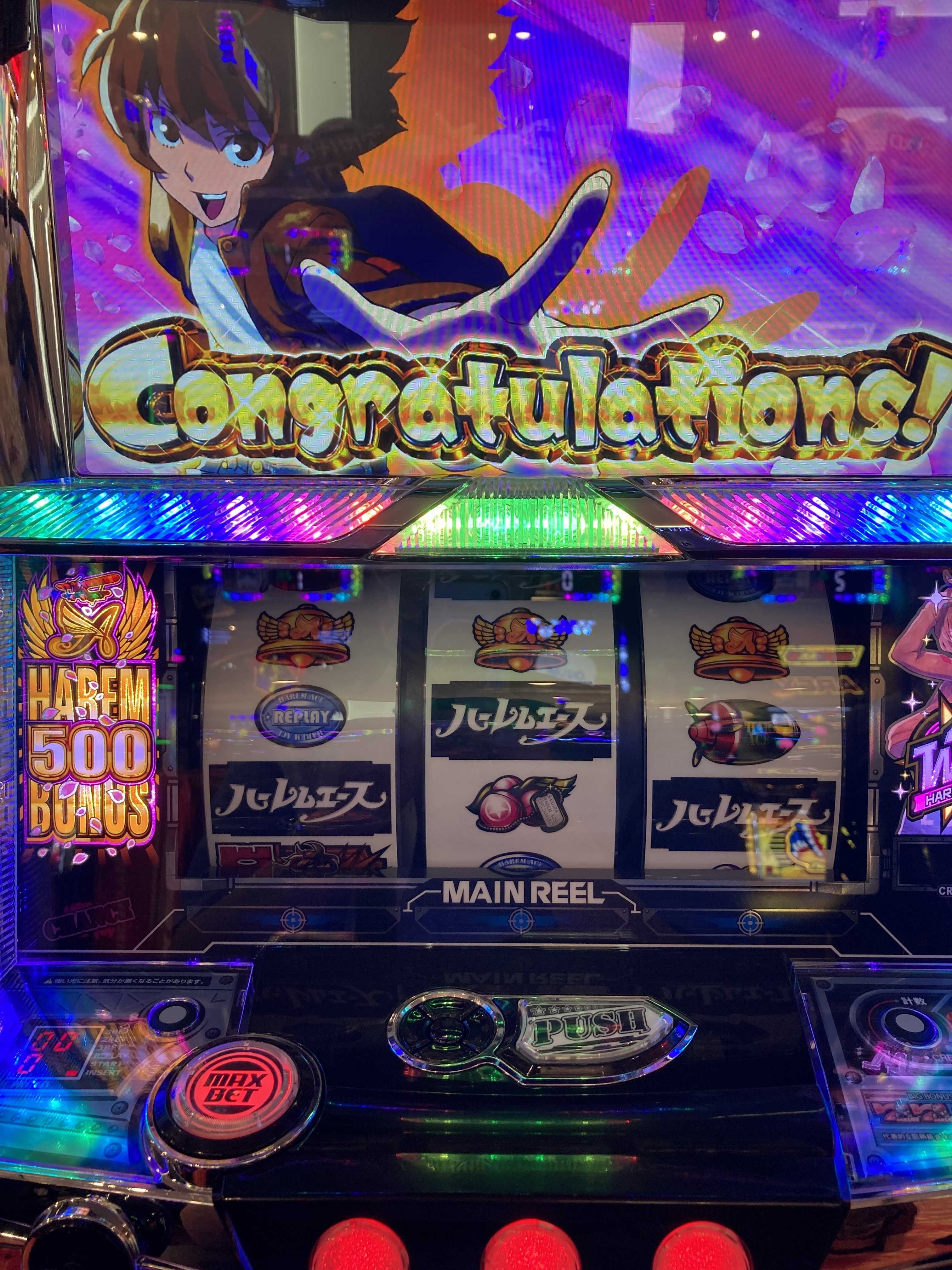 法律が変わるたびに獲得枚数が少なくなり厳しい戦いが強いられているパチスロのAタイプ派手さはないがパチスロの醍醐味である出目を楽しめるのもAタイプであるが流石に出玉的にキツすぎる!ちょろっと打って当たってじゃーねーをするには即辞めしたとしてもプラス4000円程度。5号機(ボーナスで300枚とれた)の頃は1000円ジャグラーと称した1000円だけ打ってBIG引いたらいい感じに辞めてプラス5000円みたいな!閉店くんがそんな企画でしたよね(笑)だがしかし!パチスロにもBT(ボーナストリガー)なるものが実装されたことでAタイプのショボ獲得枚数を疑似的に超えれることになりましたほんとパチ業界のルール内で最善を尽くす姿勢には関心するわなので満を辞して打ってきましたよ!翔べハーレムエースを!初代から知っているので楽しみではあったんですよねていうか、初代は400枚とれるボーナス無かったから初代より一撃は多いというのも魅力です率直な感想としては、単純に懐かしい!ってなりました。音楽・出目・演出などの当時の再現度の高さです。ハートスコープ演出とかめちゃくちゃ懐かしかったです!そして何より有難いのがコイン持ちの良さです。設定1でも40回転以上とジャグラーより優秀♪まったりチャンスを狙えるのがいいですね変な所で押すと2連サクラ(チェリー)が片側しか止まらずに払い出しが減る仕様も健在でした(笑)そんな中、上段ベルからのフリーズでしっかりBT引いてきましたよ!今のところの感想ではありますが、設定が入らないと考えると設定1でも完全攻略で機械割100%を超えるので優秀かと思います。ジャグラーの1打つくらいなら、間違って出ることも多そうなのでワンチャンありそうです1000枚くらいならわりと簡単に出ましたよジャグラーで1000枚出すのめっちゃ大変だからねただボーナス確率が重めなため、初当りでつまずいたらキツイ印象でもありますまぁいずれにしても導入が少ないので打てる機会はそんなに多くはないのかも知れませんね私は可能性を感じられたBT機をどんどん打っていきたいそんなことを思う今日この頃でした。