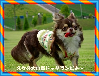 あたいはチョコだよ。 久々に大自然ドックランに来たよ。最近成長期なのか、この間買ってもらった服がもうチビシャツに・・ でも体重は1.7Kgなんやけどね~やほぉーー やっぱ、ここは最高やで~ 思いっきり走れるし、それもノーリードで、、、自由やーーーー おとんと歩くときは、右側があたいの指定位置なんよ道路をノーリードで歩いてもいつもこの位置なだよ。だから普通の散歩もノーリードで大丈夫なんやけど、おかんが危険だから駄目って・・・ 厳しいの~ここ大自然ドックランは最高に良いところなんやけど、友達おらんのよ~ 親子連れとか子供会らしき人達がBBQとかを楽しんでいますが、ワンコの姿はない。でもねおとんとおかんが居るからあたいは寂しく無いよ。おとん、また連れてきてや~ って毎日帰りが遅いし仕事大変そうやね。たまには息抜きしないとあかんよ!!って思っているかは・・分からんけどね(笑)