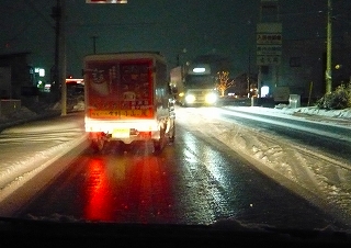 今日の雪と寒さは半端じゃない。会社の帰りは大変。大変と言うより、超危険な状態。※運転しなから撮ったので、チョットピンボケだけど・・・。「おいおい」「あなた、、真っ直ぐ走ってくれーーー!!」「なんか斜めになってるぞ~」「これぞミラーバーン!!」 それもただのミラーじゃない。表面が若干解けかかっているから、メチャメチャ滑る。まるでスケートリンクと化した路面なのだ。この深々と降り続ける雪。。ロマンチックでいい感じ~ んな訳ないでしょうに。。わては嫌い、寒いの嫌い。チョコはと言うと、暖かい部屋でぬくぬくしてます。。外に出しても数分と持たず、直ぐ直ぐブルブル震えてしまう軟弱チョコ。この分だと、明日の朝は一面が銀世界と化しているでしょ~朝に照らされるとまさに白銀。この瞬間だけは好きだけどね~う~~ 寒い!!
