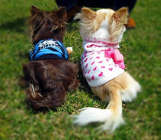 4/301年ぶりにフク・チョコ揃ってドックランに行って来ました。ここ大自然ドックランはいつ来ても最高。天気もちろん晴れ。それも抜ける様なブルースカイ雲ひとつない快晴。気持ちイーー!! フクは昨年より顔がレディーに成ったかも。洗礼されて来たのかな~? それに比べてチョコは・・・ますます男らしく凛々しく・・・・ チョコ、そんなことないよ。愛嬌があって可愛いですよ。って言ってる側からチョコは・・・お腹が空くとカバンからおやつを勝手に取り出して、持ってきます。。2チー仲良くお座りです。 こんな感じで楽しい一日を過ごしてきました~さて明日はなにする? フクチョコ!?