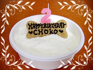 今日(11/25)はチョコの2歳の誕生日!!体重はまだ2kgもないけど、一応2歳になりました。人間の歳にすると23歳の様だけど・・・どうもまだまだパピーって感じだ。。昨日と今日。前夜祭からパーティーです。《前夜祭》シンプルなケーキで前夜祭!!でもチョコは大喜!!でもあまりに写真を撮りまくってたら飽きたようでこの態度・・・・・・。ごめんごめん。早速食べました。《当日》フクママから貰った服と冠。早速着て、付けてみましたよ。フクママありがとーー。しかしながら・・・・・これはチョコに取ってはメチャ辛そうじゃ(笑)一応付けてみたけど・・こんな感じになってでー。ってどんな感じですか?ここで事件が勃発!!ななな・なんと、チョコママとチョコパパが別々にケーキを買って来てしまったんよ。共に「昨日のケーキは寂しかったんで・・」との理由ですが・・ 嬉しいような無駄遣いの様な・ まぁ~なんか賑やかになって良いかそんなことがあって、またチョコは大喜び!!選ぶチョコの目がマジだったりしてでもチョコが食べれるケーキは・・・・と言うことでチョコのお祝いは、ママ・パパで美味しく頂きました~食べ過ぎた・・・当分ケーキは要らんかも(笑)