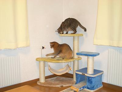 嫁と二人で買い物してたら、思わぬ猫グッズに遭遇♪つい衝動買いをしちゃいました(^^;(黄色が今回買ったキャットタワーw 青いのは以前買ったやつです(^^)そう、キャットタワーです(^^以前買ったキャットタワー(青)は小さくて、下の部屋の部分にも穴が開いてる状態。ま、猫的には全然気にならないんでしょうけど、新しいキャットタワーの展示品を見て、つい、猫たちが遊ぶ姿を想像して・・・思わず、「これ、いいかも・・・w」となって、早速レジに持っていっちゃいました(;´∀`)嫁と二人で、「これって、かなり猫にやられてないかい?」と苦笑い・・・♪(・∀・;ノ)ノ