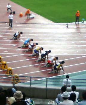 7月1日長居陸上競技場で、日本陸上競技選手権大会見て来ました長居には、遠い遠い昔・・・中学の頃、テニスの大会に参加したことがあるのだけど、陸上の大会を見るのは初めてで、面白かった大阪市?の無料招待チケットで、友人が行けなくなった為、譲ってもらって行きました8月25日~9月2日まで行われる、世界陸上選手権大会の、代表選手選考会を兼ねた大会で記録更新も期待されたものでした残念ながら、新記録は出なかったみたいですがテレビで見る選手達が目の前に沢山居て、レンタル(無料)ラジオを借り裏側のネタなんかも聴きながら、2時から表彰式終了の6時あたりまで、とても良い時間を過ごせました同時に色んな競技をやってる時間も有って、少し頭が痛くなりつつも楽しかったです走り幅跳びの池田さんの時の、観客の手拍子・・・走り高跳びの醍醐さんの手拍子&クリアした時の歓声・・・スタート直後にコケながらも、ぶっちぎりの走りで勝った福士さん・・・彼女のインタビューも面白かったし、こっちが元気になれる笑い声・笑顔・・・写真は、100メートル決勝のスタート場面ですこの中にいる、朝原宣治選手を応援してます今回は2着でしたけど無事に選ばれた(最年長です)ので、本戦は頑張って欲しいです代表選手も決定したし、本大会も楽しみですあっ!競技場へは、JR阪和線の‘鶴が丘’からが早いのかも・・・と思いました