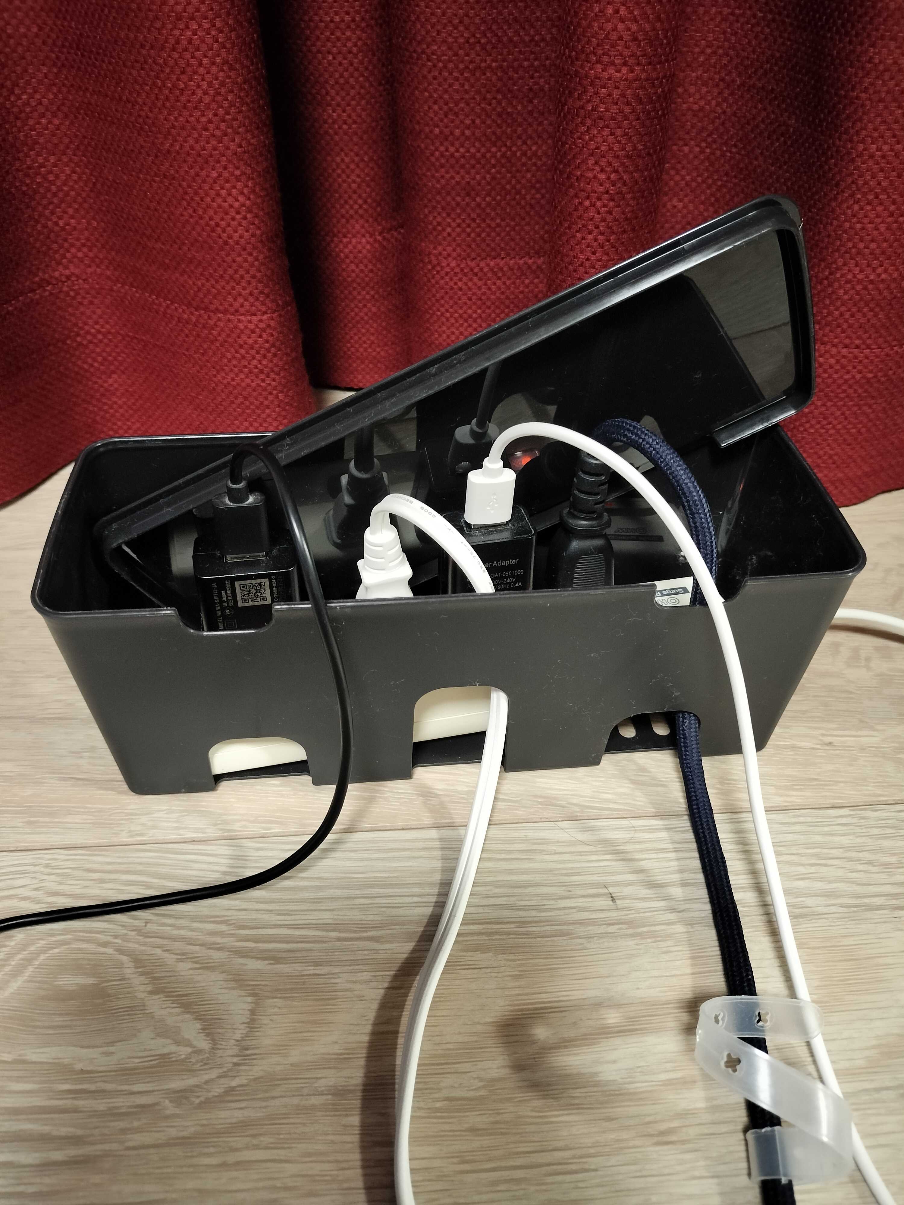 ケーブルボックスを100均で買ってきた。失敗した〜〜!!全く収まってないから蓋がしまらないーー皆さん、買うときはよく確認を。