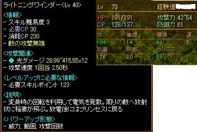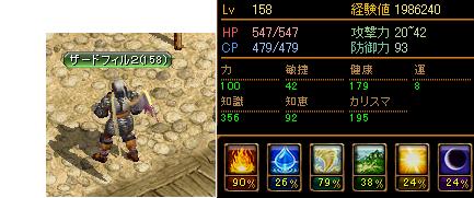 1度にいくつまでの耳会話をこなせますか?自分は4人と耳会話してるだけで、中の人は目一杯です。こんばんわ、ザードフィルです。そういえば、リンク頂いてる青鯖のおすぎさん、サブのWIZのステを出してましたね。じぶんと同じレベルで運WIZなので同じく出したいと思ってたり。まあ今更ですが、健康初期値+補正や装備のみです。これも今更ですが、運WIZはやはりチリに限るとも思ってます。HP1000くらいで速度手装備で1匹ずつ相手すれば遅くても普通に狩りできますものね。運メテオだと範囲って時点で運キャラ向かないよね・・・これからちと装備見直してみようかなとも思ってます。今持ってる装備で、現時点では手に力比率LV2使ってます(力初期値で装備できるもので、銀行にある力固定腰117装備して手を攻撃速度23%OR20%か、知恵比率LV2に変えて見ようかなと・・・頭は知識比率LV2ですが狩場によって運LV10の頭でもいいかな・・と。これからのステ振りはやはり狩場で2撃で狩らなければ、こっちが普通に死ねるので、知識=運で振って行こうとも思ってます。んでスキル晒し、久しぶりですが。メテオ・フォーベガ・ヘイストマスターですね。雷1水幕1石1取ってます。雷は集めるのにいいですね、水幕は見栄です。石はメテオで滅せれない敵を固めようかと思いましたが魔法判定で結構失敗するので、ネタです。アスヒがこのスキルレベルで99%回復なので結構便利です。今後はチリマス、取得してないスキルを1づつ取る、後はエンチャと水幕ですかね。あと意外に気になるのがショートカットの配置ですよね。オートスキルは別枠でオンオフにしとくとそれなりに便利ですよね。まあ、WIZでオートスキルはないので関係ありませんが。チャージは剣士も天使も武道家もおなじ位置で合わせてますね。上段に支援スキル並べてたほうが連続でできて楽です。Aに雷で釣り、マウス↑のFVも釣り用ですね、まあ、ギルハンとかでメテオ撃つ時アスヒになるのは仕様です。とまあ、一通り晒したとこで青鯖に訪問。ええ、例のあの人です。解る人には解る、自分とめるさんの共通点です。左のリンクサイト「ちょこちょこ」の人ですね。・・・・・・うん、言うまでもなく年齢が解る会話です。つか普通に振っても即返ってくるのがすごいよね・・・あ・・・・めるりんが・・・・2人・・・・・説得覚えたら、弓の敵捕まえて名前も決めてるのは内緒です。まあ、時間が時間なのでおすぎさんに耳してもいるかどうか不安でしたが・・いました。ええ、真面目に選択職業別の血液型診断の話してました。支援の人はO型多いんじゃないかと・・・WIZはB型、剣士テイマーはA型が多いと、勝手に2人で予測、天使やサマナはAやAB型かな・・・とメテオでソロWIZ、天使、壁剣士、で武道家な自分はAB型です。お二人共、長くお話しましたがとても楽しい方達ですね。時間を割いていただき感謝です。ギル戦あとのイベントリ最近、BISの姿で灰使います。リザ直後と間違えて敵さん向かっていくのでこれもありかと。てか昨日のギル戦はマジできつかった・・・呪い抵抗指2個したらそんなに異常喰らわないので、聖水だけにしようかと思う今日この頃。エンチャ失敗した指露店中。10~20万で処分してました。中の人混乱してます。4人で一杯一杯。聖徳太子ってすごいよね・・・そんな感じで今日は終了です。