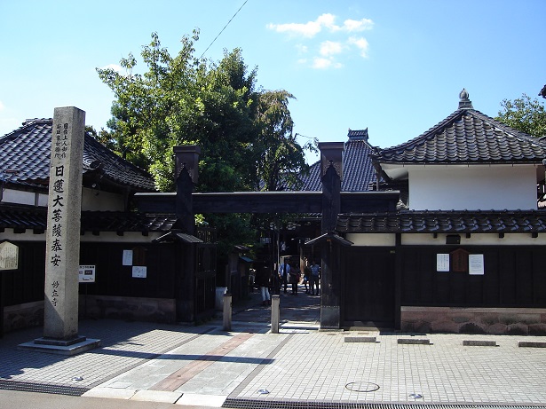 金沢散歩(22)卯辰山寺院群 蓮昌寺(Renjyo-ji) 西養寺(Saiyo-ji) 2015年4月23日更新金沢には、お寺が集められた場所が3箇所有り、寺町寺院群、小立野寺院群、卯辰山寺院群と呼ばれています。1616(元和2)年、前田家三代当主利常(としつね)の時代、一向一揆対策と外敵侵入を防ぐため、金沢要所に寺院を集めたそうです。卯辰山寺院群は、ひがし茶屋街の周辺。寺院の数は40寺以上。古都の風情が色濃く残り緑に覆われ、日頃忙しい人々へ癒しの場所としてふさわしい地区です。ただ、山麓に建てられた寺院ですので坂道が多く、お年寄りにはなかなか大変。また、細い小路ばかりですので迷子にならないようご注意ください。【交通アクセス】⇒金沢駅兼六園口(旧東口)からバスで15分程度。有料駐車場が有りますが、日曜祭日は混み合いますのでご注意ください。[日蓮宗 蓮昌寺(Renjyo-ji)] 卯辰山寺院群のちょうど中央辺りに位置する寺院。天正10(1582)年、僧日寿によって創建されました。大本山京都妙顕寺の系列で、泉鏡花の小説『縷紅新草』の舞台としても知られています。また甲賀53家のひとつ多羅尾家の菩提寺でも有ります。およそ3000坪の敷地を持ち、本堂の後ろの裏山には深い森が広がり、金沢市の保存樹林に指定されています。また山門は金沢市の有形文化財。境内にはモリアオガエルが生息し、オオウバユリが群生しています。[蓮昌寺 本堂][蓮昌寺の桜][蓮昌寺の大仏]金沢三大仏のひとつ。高さ約5m、木彫りの大仏です。元禄年間(1688年~1704年)に作られたと言われています。その姿は、一切衆生に安楽無畏、人々のさまざまな願いをかなえることを誓う「施無畏与願」(右手を上げて手を開いて指を伸ばして掌を見せ、左手は下に垂らしている)の印を表しています。本堂左手の建物の中に有ります。どなたでも自由に扉を開いて入って拝んでも良いそうです。[蓮昌寺 背戸の建造物]「草木國土 悉皆成仏」と書かれています。[蓮昌寺 蕉門の俳人 秋の坊の碑]秋の坊は、元禄2(1689)年、芭蕉が『奥の細道』で金沢を訪れた折りに弟子になった俳人です。元は前田藩の武士でしたが、武士を捨て髪を剃り、秋の坊と名乗り、蓮昌寺内の塔頭「實教院」で僧、寂光として止宿しました。辞世の句⇒ 「正月四日 よろず此の世を 去るによし」 [卯辰山寺院の細道}車が行き来できる道路も有りますが、このような細道がほとんど。平日は人通りも少なく散歩に最適です。[天台宗 西養寺(Saiyo-ji)]もと天台宗真盛派5ヵ寺の一つで開山は盛学。本堂は天明4年(1784)、鐘楼は嘉永4年(1851)に建築され、金沢市内では最も古く、江戸期の寺社建築を代表する重要な存在として金沢市指定文化財となっています。七代目住職真運上人の時、越前府中に在城の加賀藩初代藩主・利家公が帰依、二代藩主利長公もまた真運上人への信望が厚かったといいます。また西養寺には、テレビにも紹介された目が動くと言われる釈迦出山図(非公開)とゆうれい釜があります。[西養寺 本堂]鬱蒼とした樹木に囲まれています。[西養寺の庭]樹木のため多少薄暗くひんやりした感じもします。[西養寺 美化小僧]この庭のお掃除は大変ですよ。[西養寺 地蔵様たち][西養寺 観世音菩薩]観世音菩薩は、ふつう観音様として親しまれている菩薩様です。『般若心経』のはじめに登場する菩薩様でもあり、般若の智慧の象徴ともなっています。胴体はいかがなされたのでしょうね。[西養寺 龍神菩薩]おそらく菩薩様を守る役目の方なのでしょうね。[西養寺 裏手の細道]ここから森へ上がれるようです。たくさんの菩薩様や仏様に出会えます。夜は怖いかもしれませんが。[西養寺 裏手の菩薩様たち]上の細道から上がると、こちらへ降りて来られます。☆☆☆ 金沢の旅館 ホテル ご紹介☆☆☆ [金沢駅周辺] [金沢繁華街]・[中心街]・[中心をやや離れた宿]☆ホームでは、石川県全域のお宿をご紹介しています。どうぞきまっし石川→ホームへ戻る